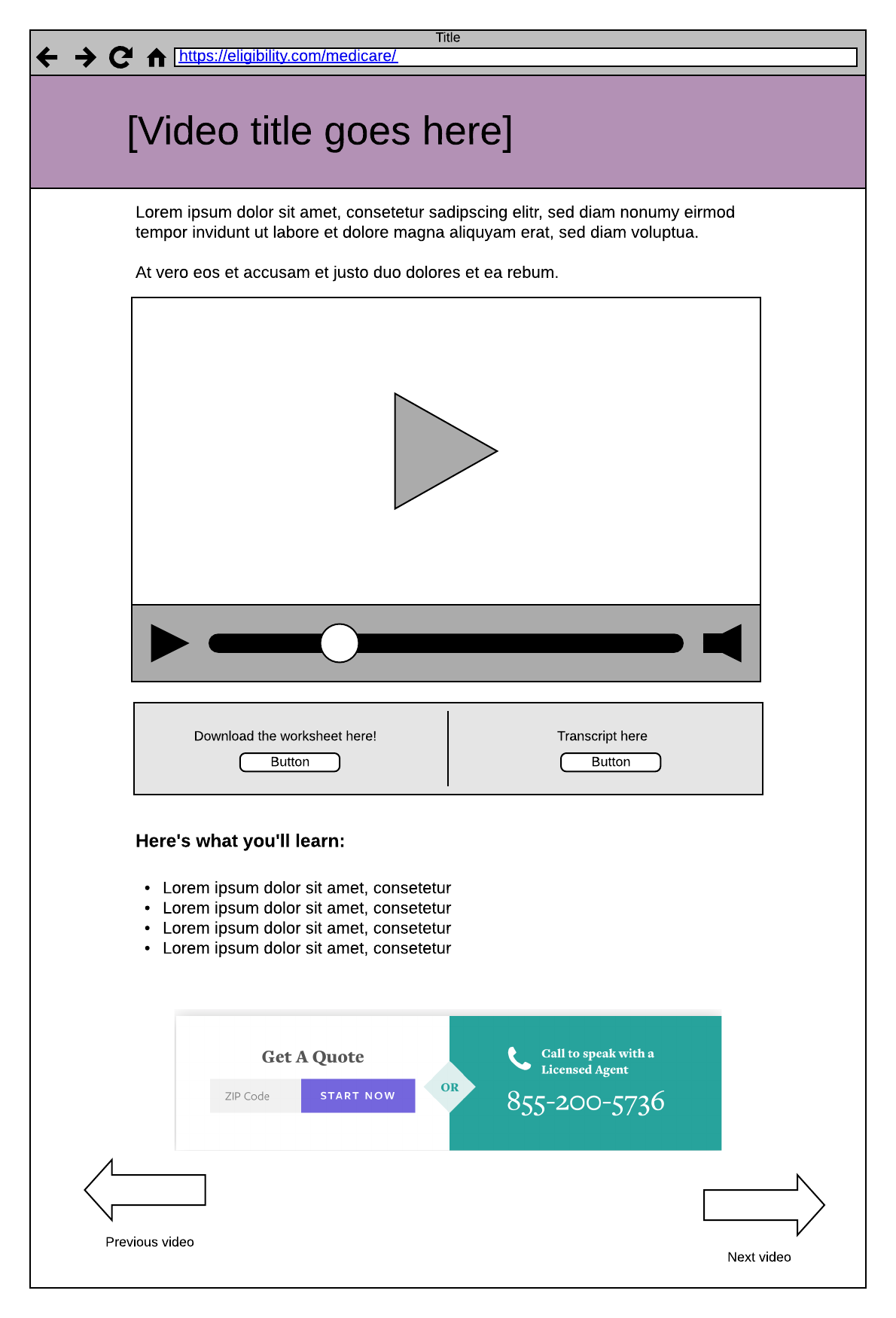 A fellow content strategist and I created a wireframe to present to stakeholders. We wanted the video to be the most prominent on the page and to provide an easy-access table of contents for the other videos in the series. We also created buttons that would lead the user to the next video in the series, or back to the previous video.